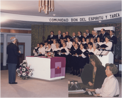 Recuerdo la acogida a los nuevos y las mil y una celebraciones: funerales, muchos –de miembros del coro, de familiares, de allegados a nuestra asamblea de misa de once…-. Y bodas, de plata, de oro; 25º aniversario del Coro Ibermex, fundado por el P. Pancho en 1966, y tantas otras…